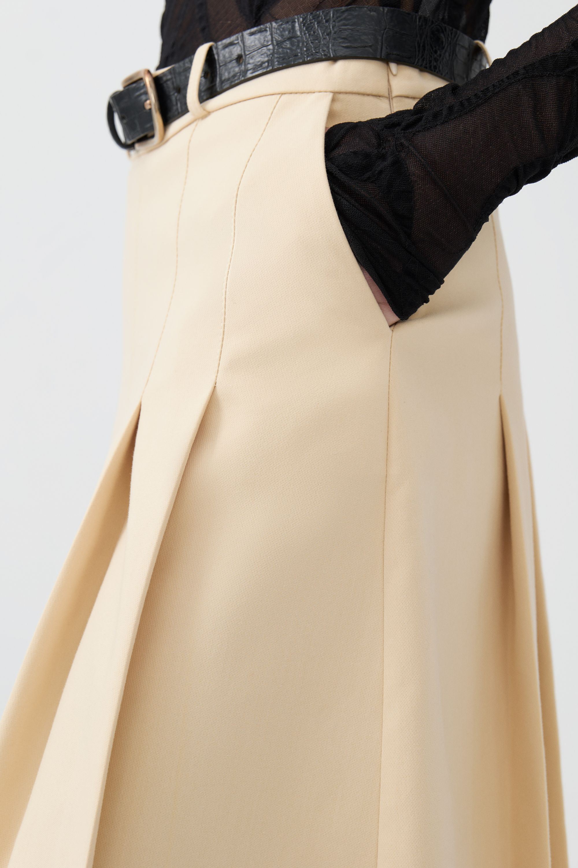 An airy, pleated fabric textures this knee-length skirt, which sways gracefully with every step. It's designed with a self-belt for all-day comfort, featuring a regular fit, regular waist, and a thick pleated design. The skirt includes a side hidden inseam zipper closure and pockets for convenience.