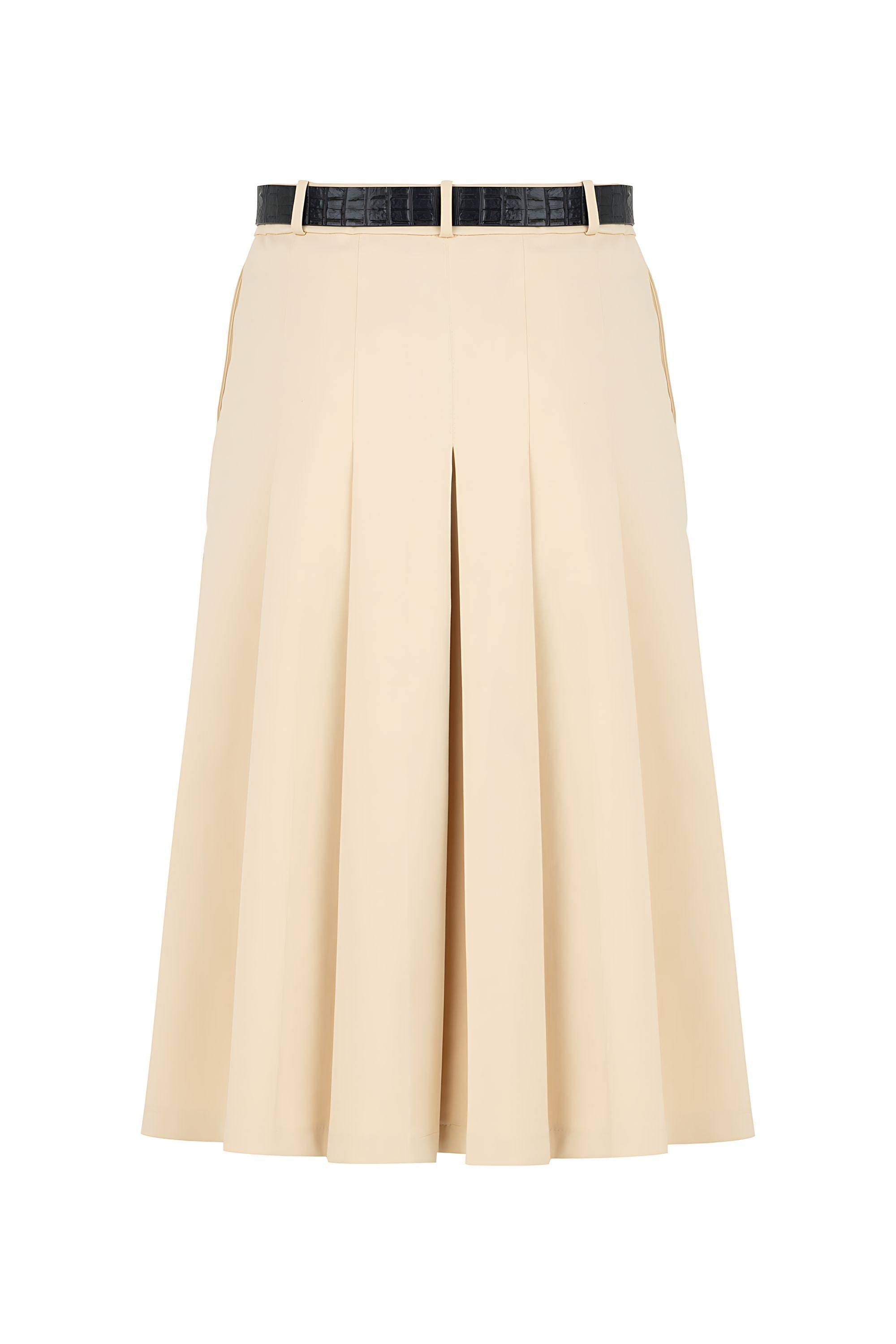 An airy, pleated fabric textures this knee-length skirt, which sways gracefully with every step. It's designed with a self-belt for all-day comfort, featuring a regular fit, regular waist, and a thick pleated design. The skirt includes a side hidden inseam zipper closure and pockets for convenience.