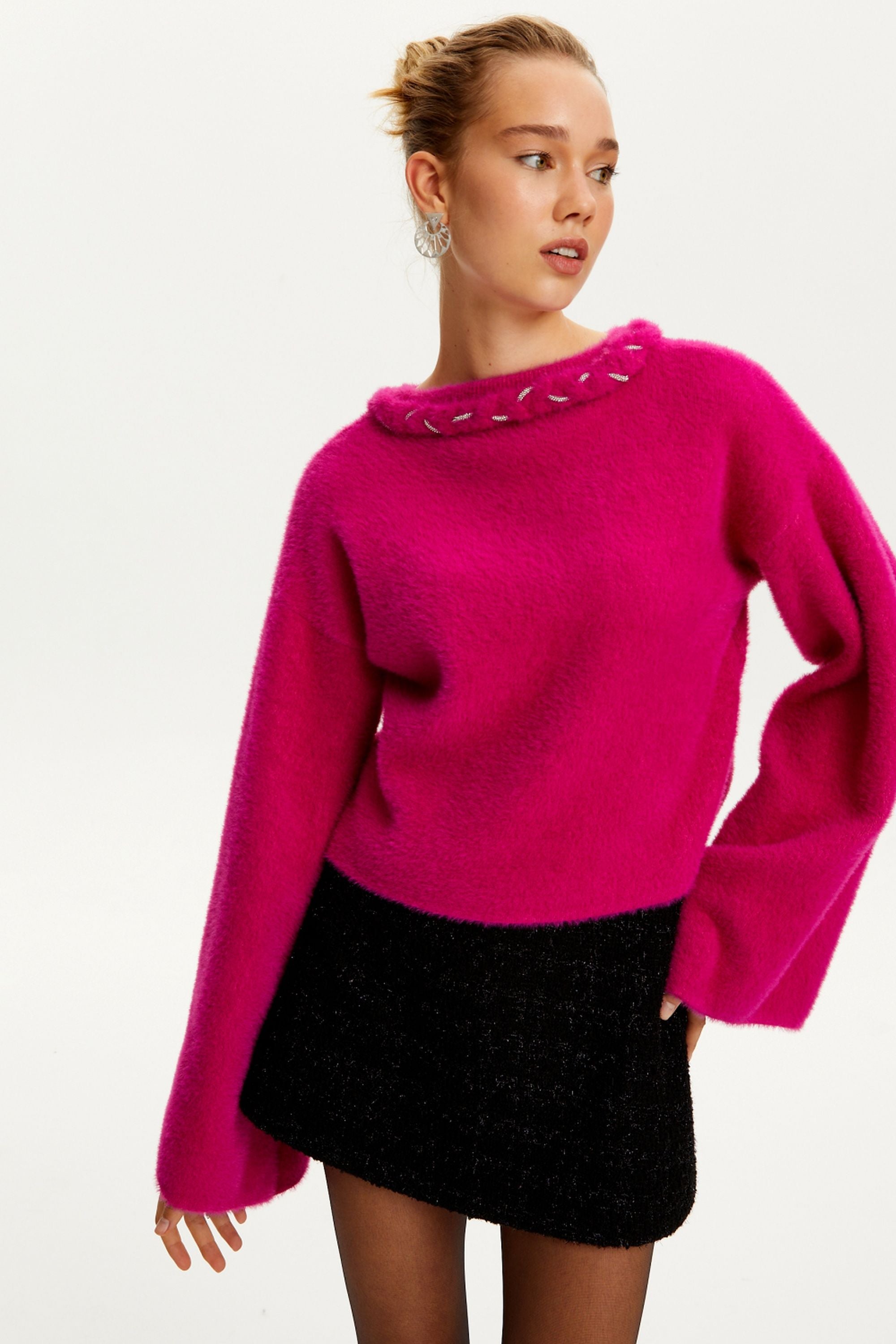 A classic for any closet, this knit sweater by Nocturne is complimented with a beautiful collar stone detail.