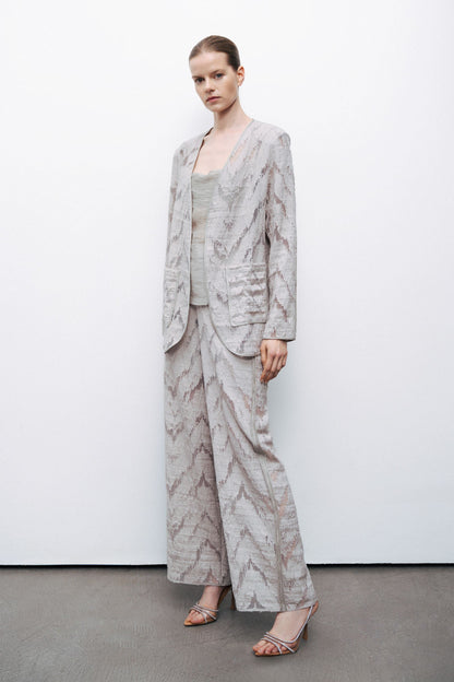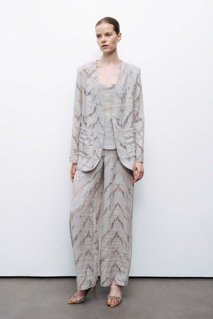 A bold yet refined layering piece, this burnt jacquard jacket features a sharp V-neckline and piping details along the sleeves and back for a tailored finish. Designed with patch pockets for added function and style, its unlined construction keeps it lightweight and versatile—ideal for statement layering in every season.